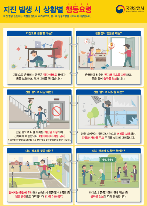 - 실내에 있을 경우: 탁자 아래로 몸을 숨기고, 머리를 보호하세요.